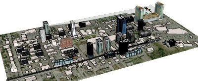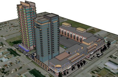 These two 3D renderings of a multi-phase high-rise residential and commercial development, and a redevelopment concept for a city's downtown core were provided to a developer for their significant project in a community undergoing a revitalization project.